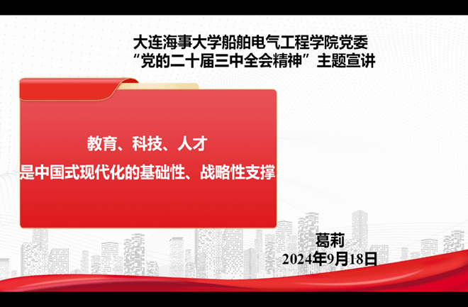 召开党的二十届三中全会精神专题辅导暨党支部书记工作例会。会议邀请大连海事大学党委讲师团讲师、“习近平新时代中国特色社会主义思想概论”教研室主任葛莉教授围绕《教育、科技、人才是中国式现代化的基础性、战略性支撑》作专题辅导。学院党委理论学习中心组成员、党支部书记、支部纪检委员参加。会议由学院党委书记徐德江主持。